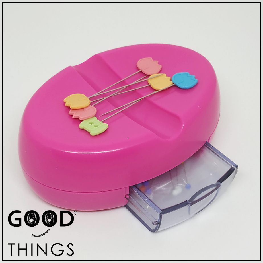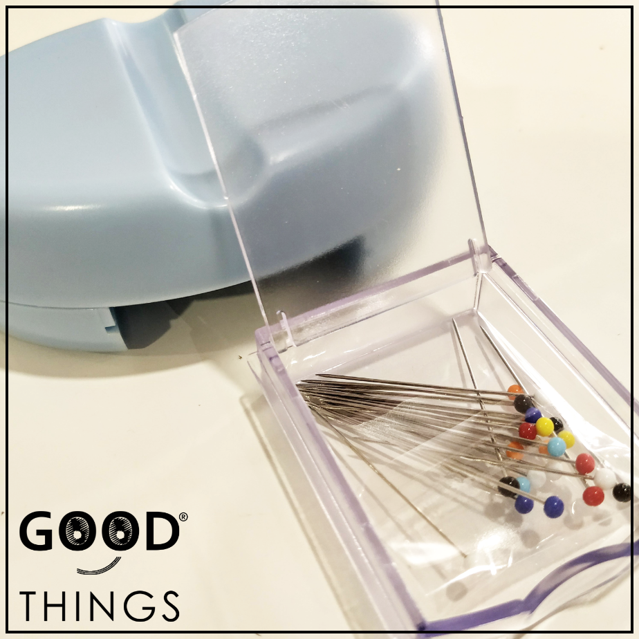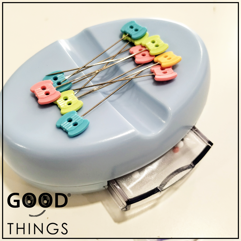 Dispõe de um íman que agarra os alfinetes e os posiciona de forma a facilitar a sua utilização.