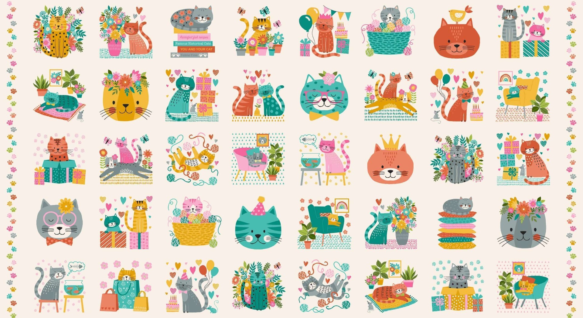 Com 40 pequenos quadrados com imagens de gatos que podem ser utilizados individualmente, em projectos pequenos, ou em conjunto em projectos de maior dimensão.