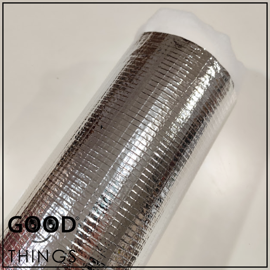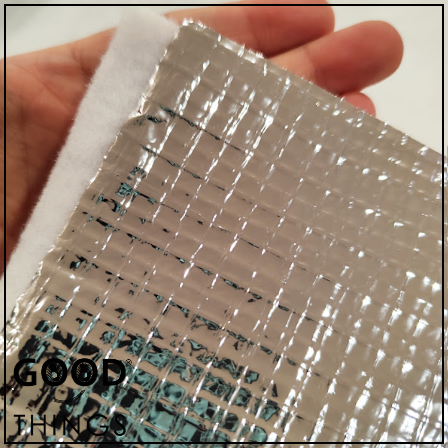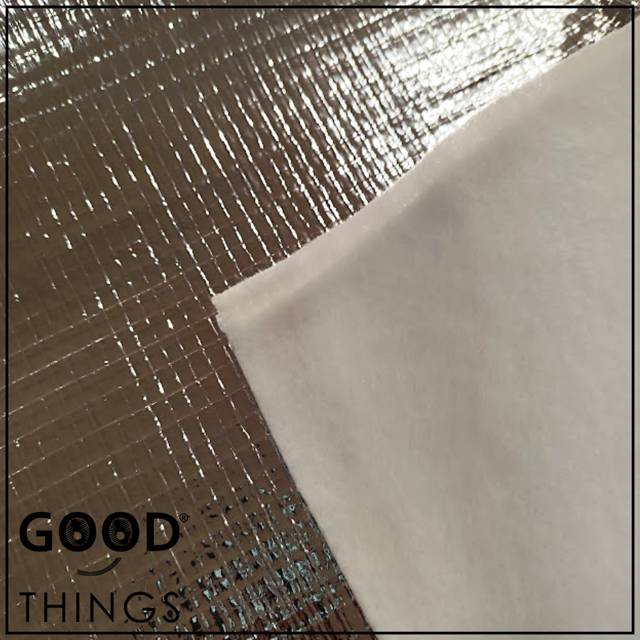 Manta térmica maleável e fácil de costurar, composta por uma camada de manta acrilica 100% poliéster e uma camada de aluminio maleável.
